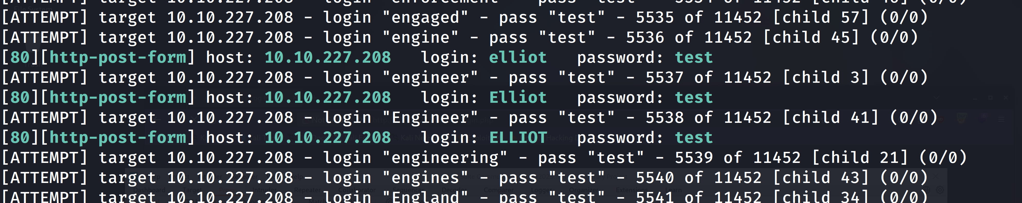 wpscan --url 10.10.227.208 --usernames elliot --passwords newwordlist.txt threads 40