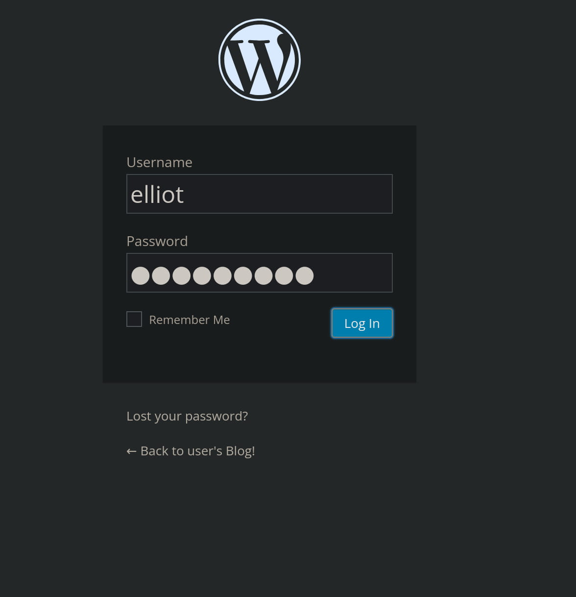 We've obtained the pair Elliot:ER28-0652. Now let's log into the WordPress dashboard with these credentials.