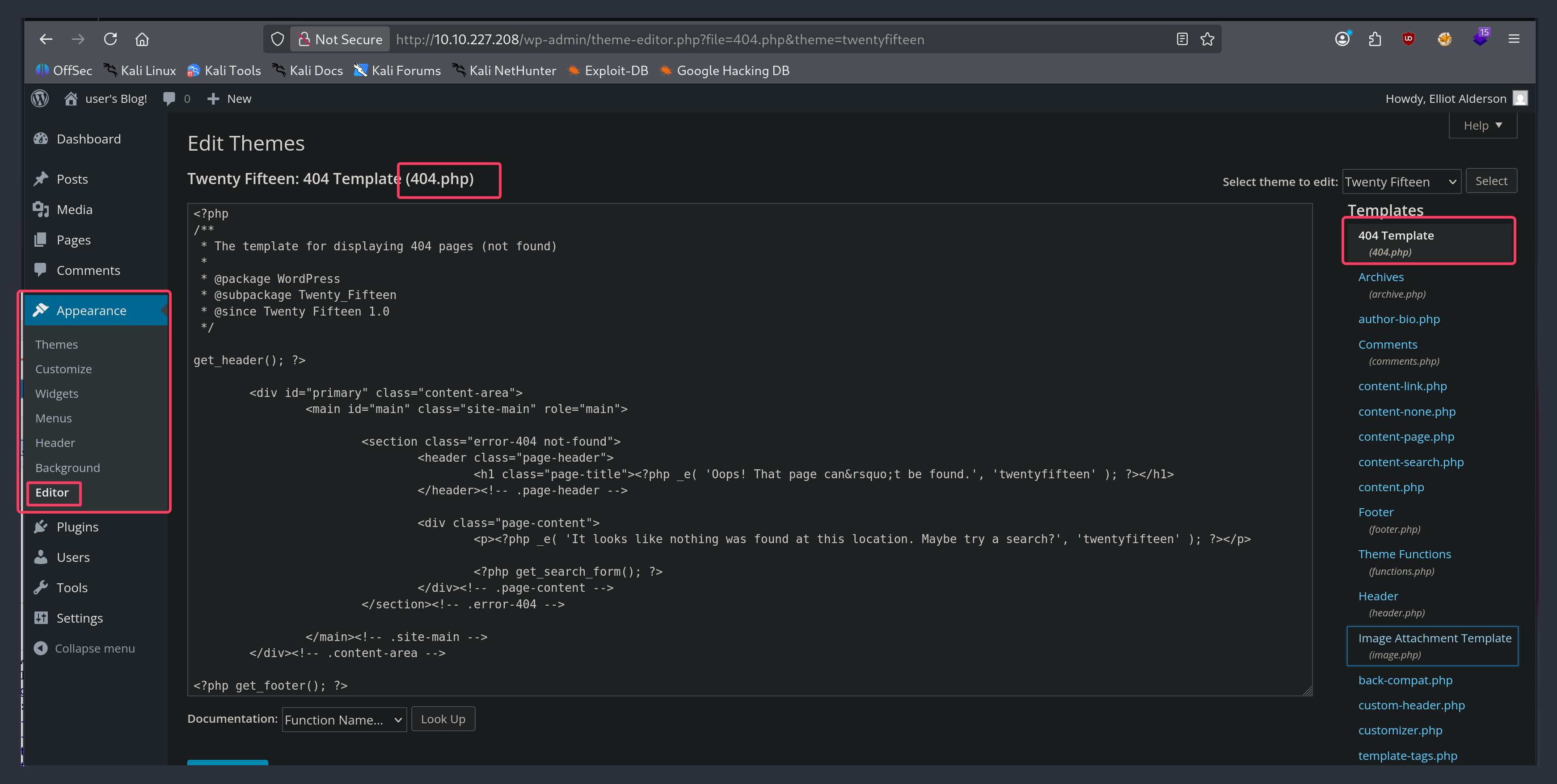Inspecting the dashboard, we see that we can edit the 404.php page in the theme editor.
