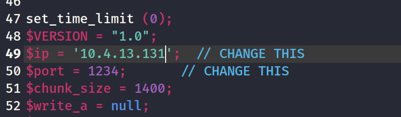 Therefore, we can place a php reverse shell here and get a shell when we make a request to the 404.php page. I will use the reverse shell located at /usr/share/webshells/php/ on Kali. Let's open this shell and configure it.