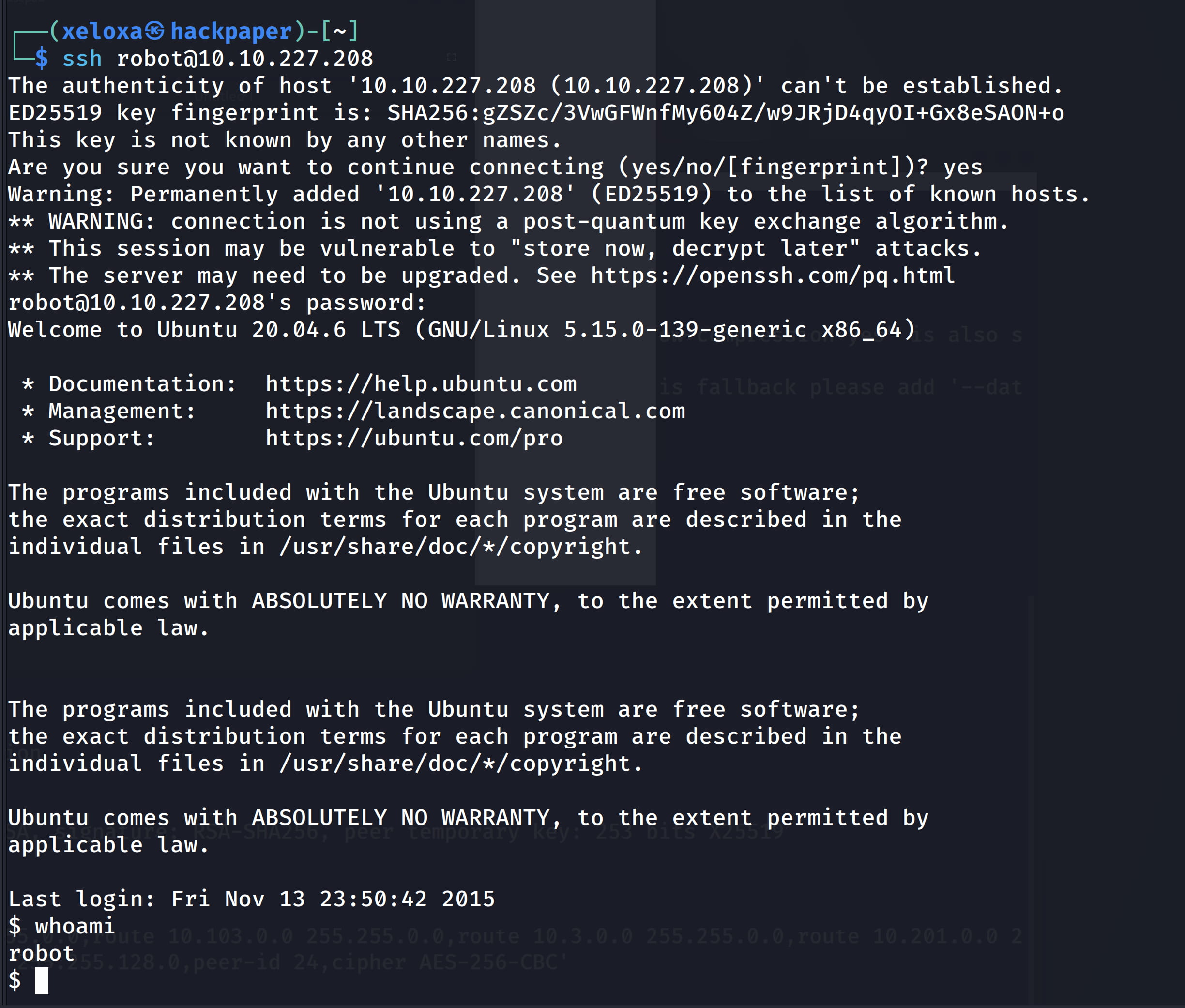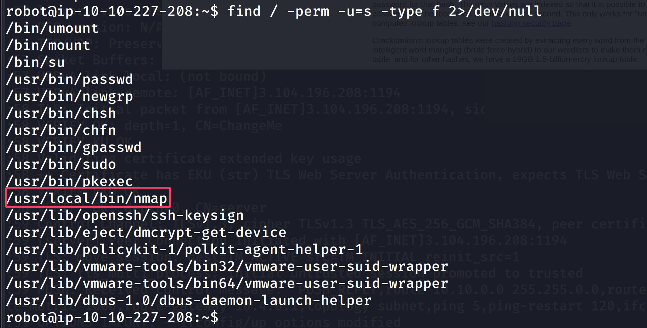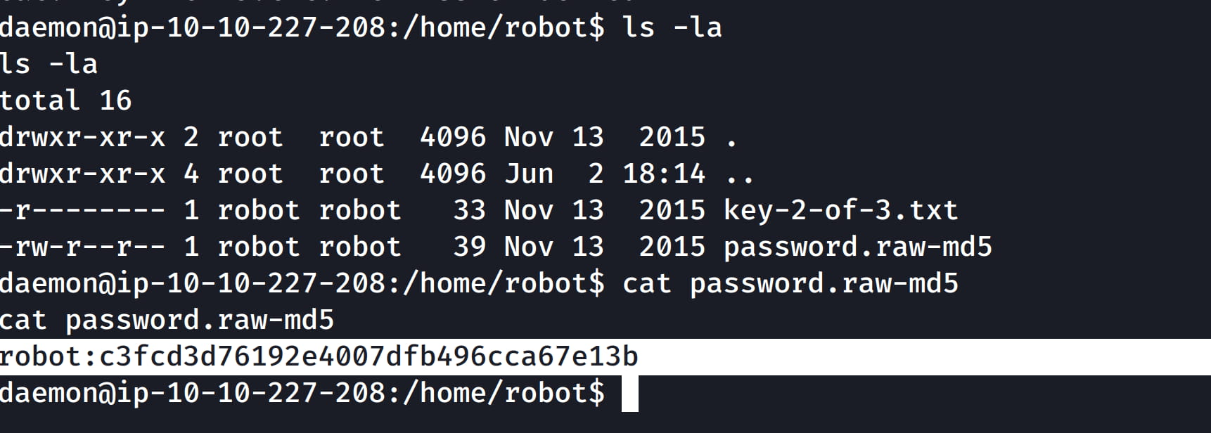 Yes, we are the daemon user. Manually exploring the system, we find our flag and a password.raw-md5 file in the /home/robot directory. We can read this password file.