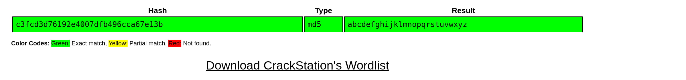 We see that this contains the credentials for the robot user. However, the password is MD5 hashed. Let's crack it using CrackStation.