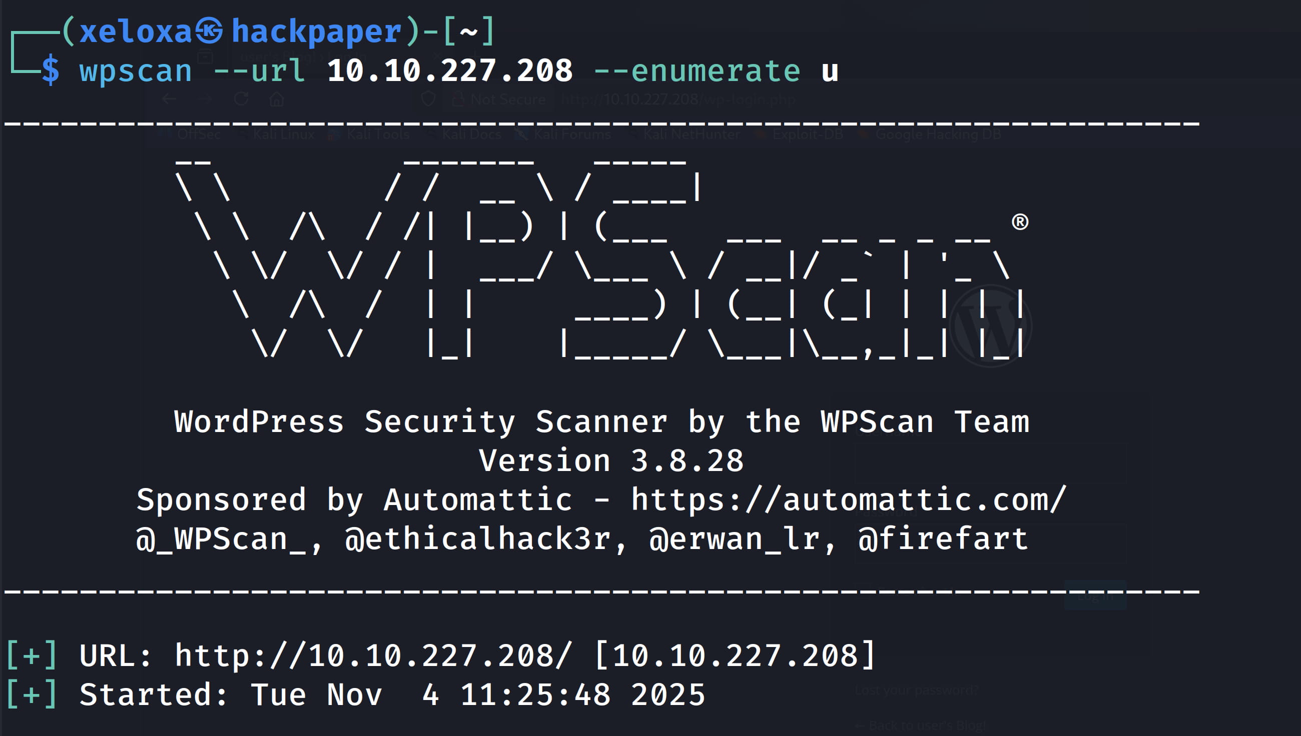 We hope to crack the password with this wordlist, but we also need a username. First, let's run a scan with wpscan on the WordPress site to enumerate users. If that fails, we'll have to bruteforce the username as well.