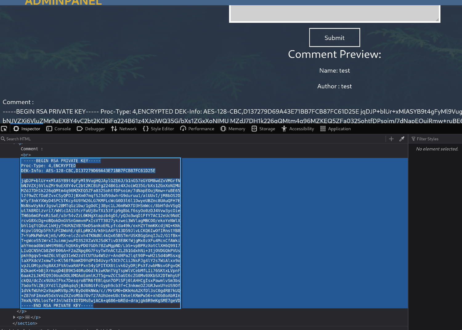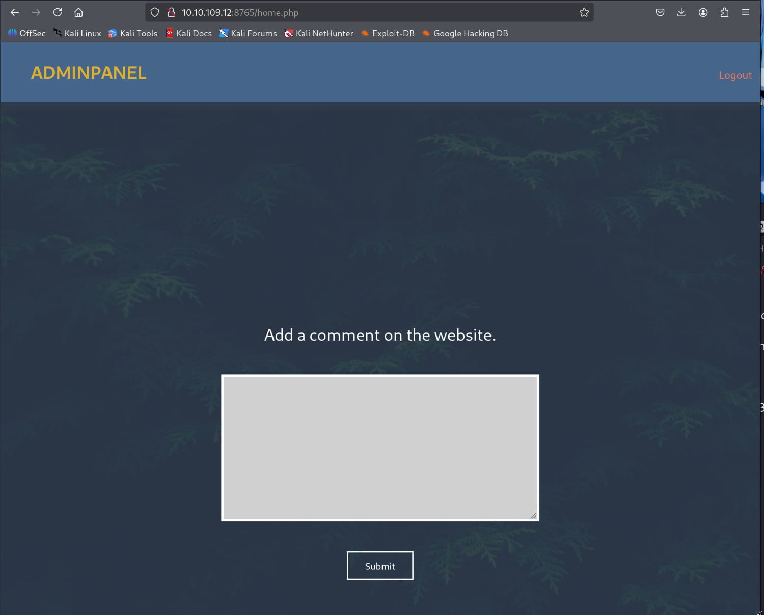 And we were able to log in. Now, we are presented with a comment submission form and nothing else. Perhaps there's something in the source code; let's examine the page's source.