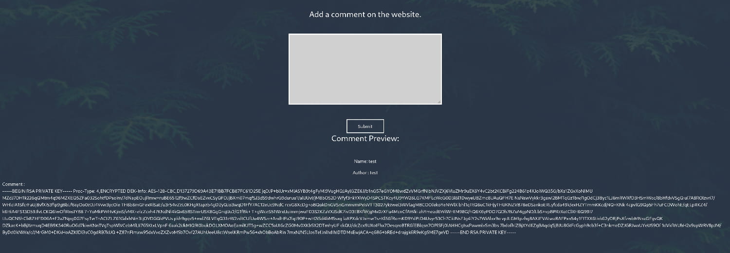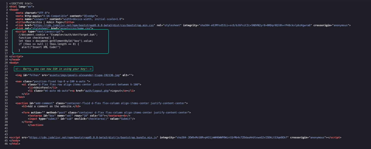 From the source code, we discover the username barry and learn that this user has an ssh key. We also see that the comment section expects data in XML format. This immediately suggests an XXE (XML External Entity) Injection attack.