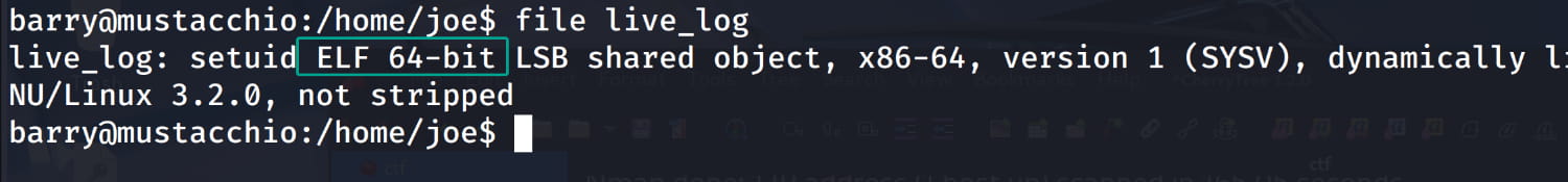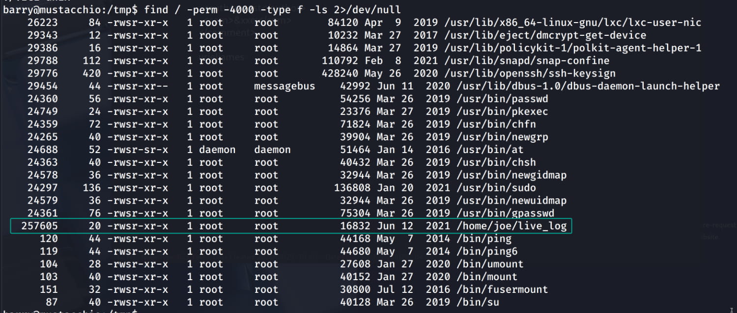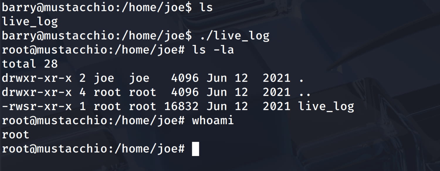 For privilege escalation, a manual analysis of the system reveals that the suid bit is set for /home/joe/live_log. This means our user can run this file with the permissions of its owner (root).
