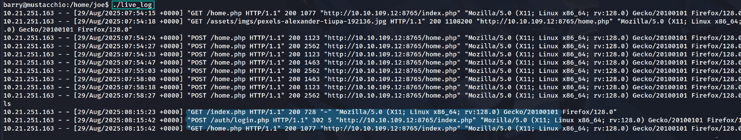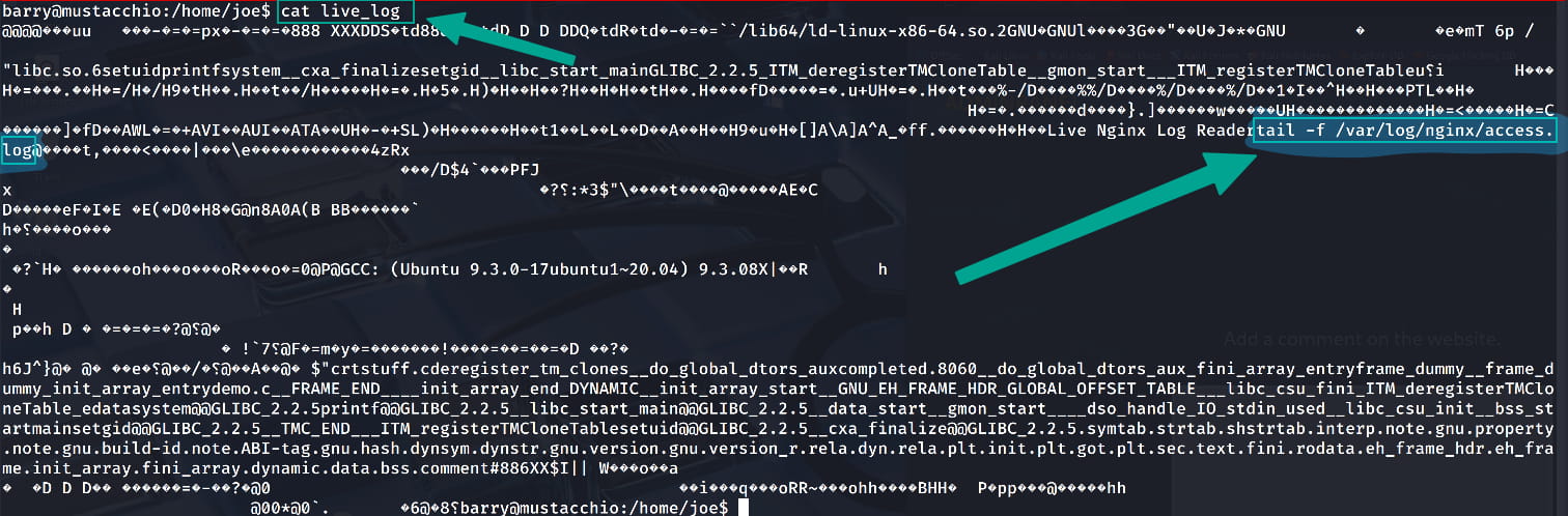 Upon examining this file, we see that it fetches the site's logs in real-time from access.log using the command tail -f /var/log/nginx/access.log. (You can also use tools like strings to inspect it.)