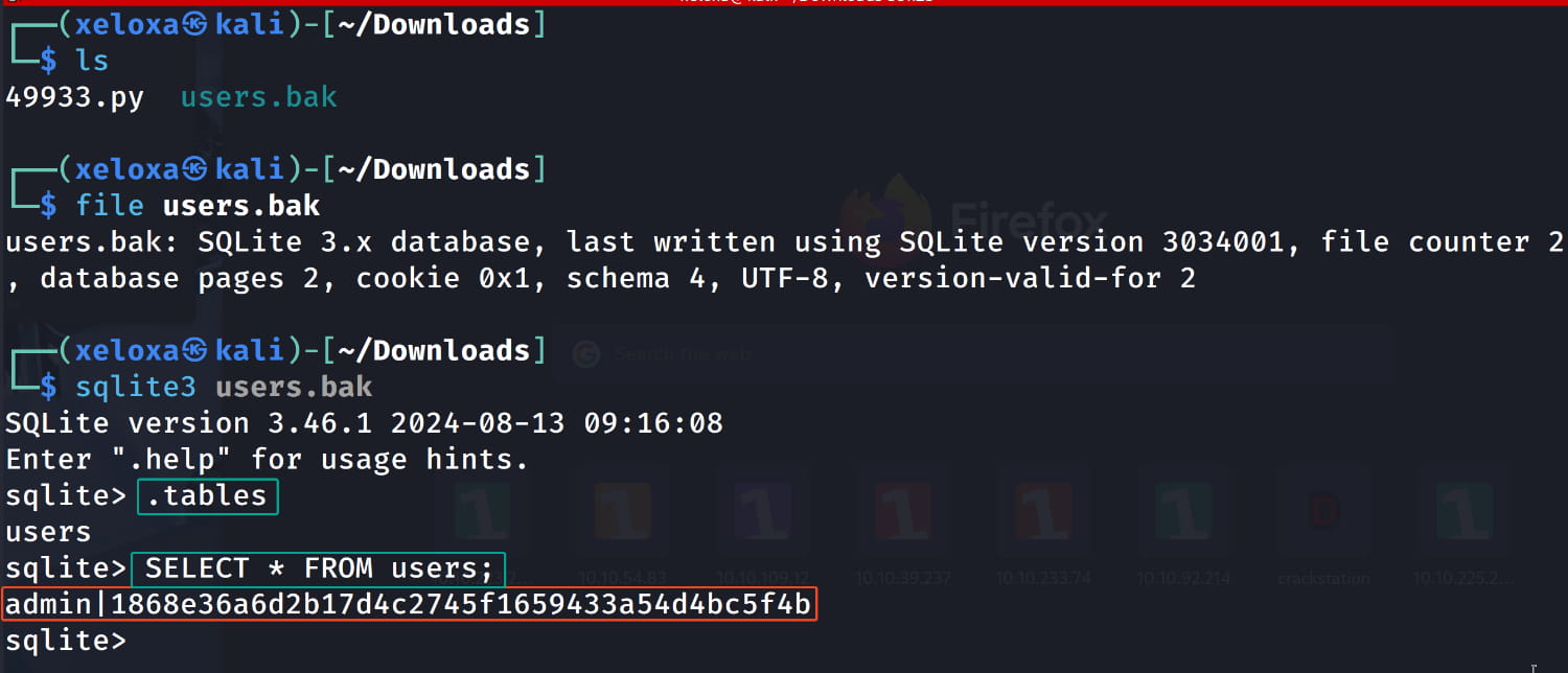 Upon inspection, we see that it's an SQLite database. When we examine it, we find the username admin and a hash. Let's try to crack this hash using https://crackstation.net/.