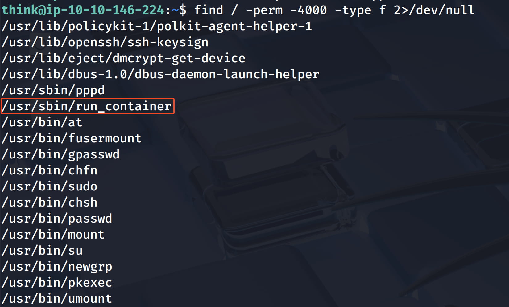 When we do a simple suid search, /usr/sbin/run_container catches our attention. So when we run this file, it will run with the permissions of its owner (i.e. root).