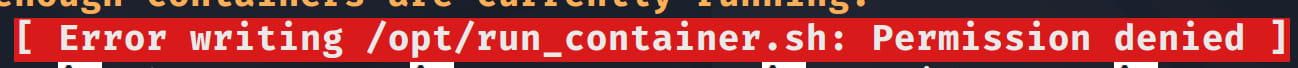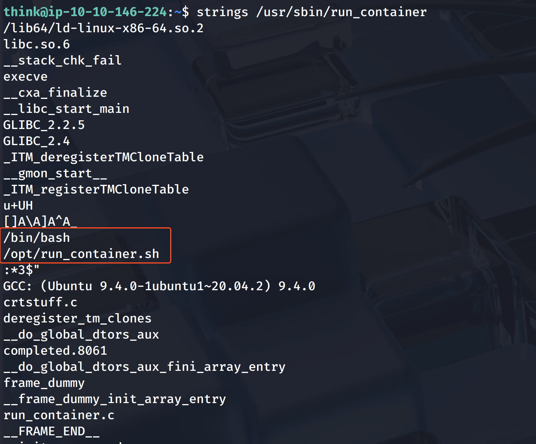 When we examine this bin file, we come across the code /bin/bash /opt/run_container.sh. (I checked with strings, there are many ways to do this. We can already see this code when we run the bin.)