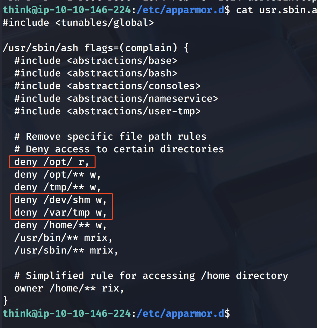 This means that when the ash shell runs the wget command, for example, that wget process also inherits this AppArmor profile. That is, the wget command runs, but it also cannot write to /tmp or the /home directory!
