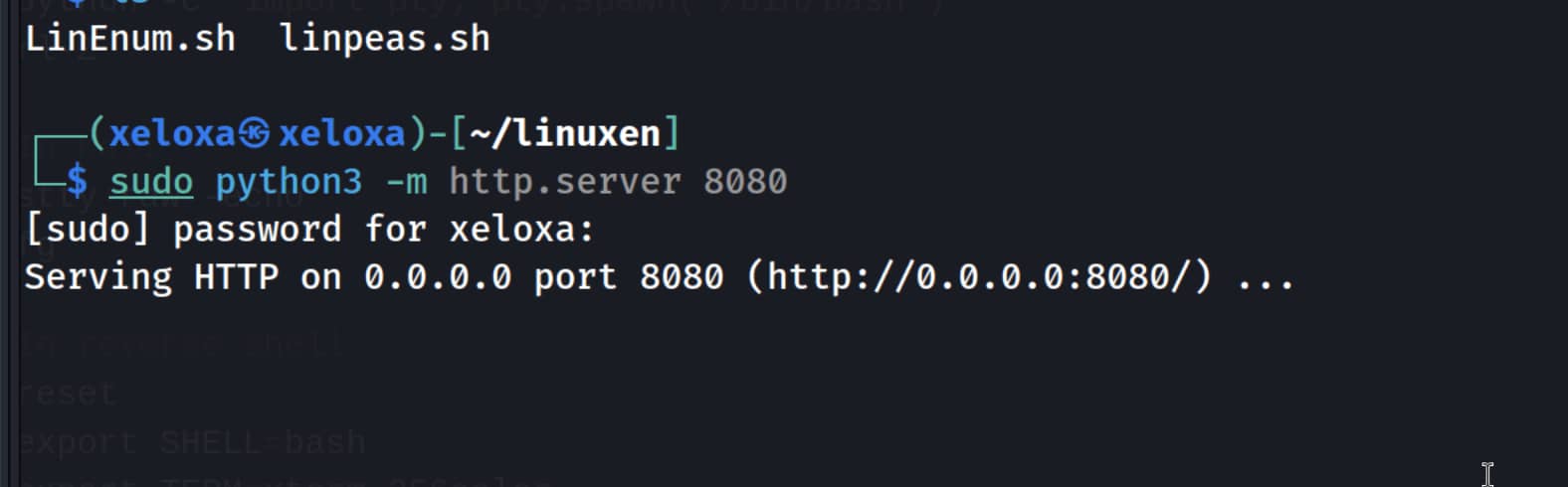 python.serverin its directory. This way, we can connect from our target system to our attack system and download this file.bash sudo python3 -m http.server 8080