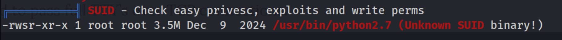 This line shows that the /usr/bin/python2.7 file has the special SUID permission and the owner of the file is root.