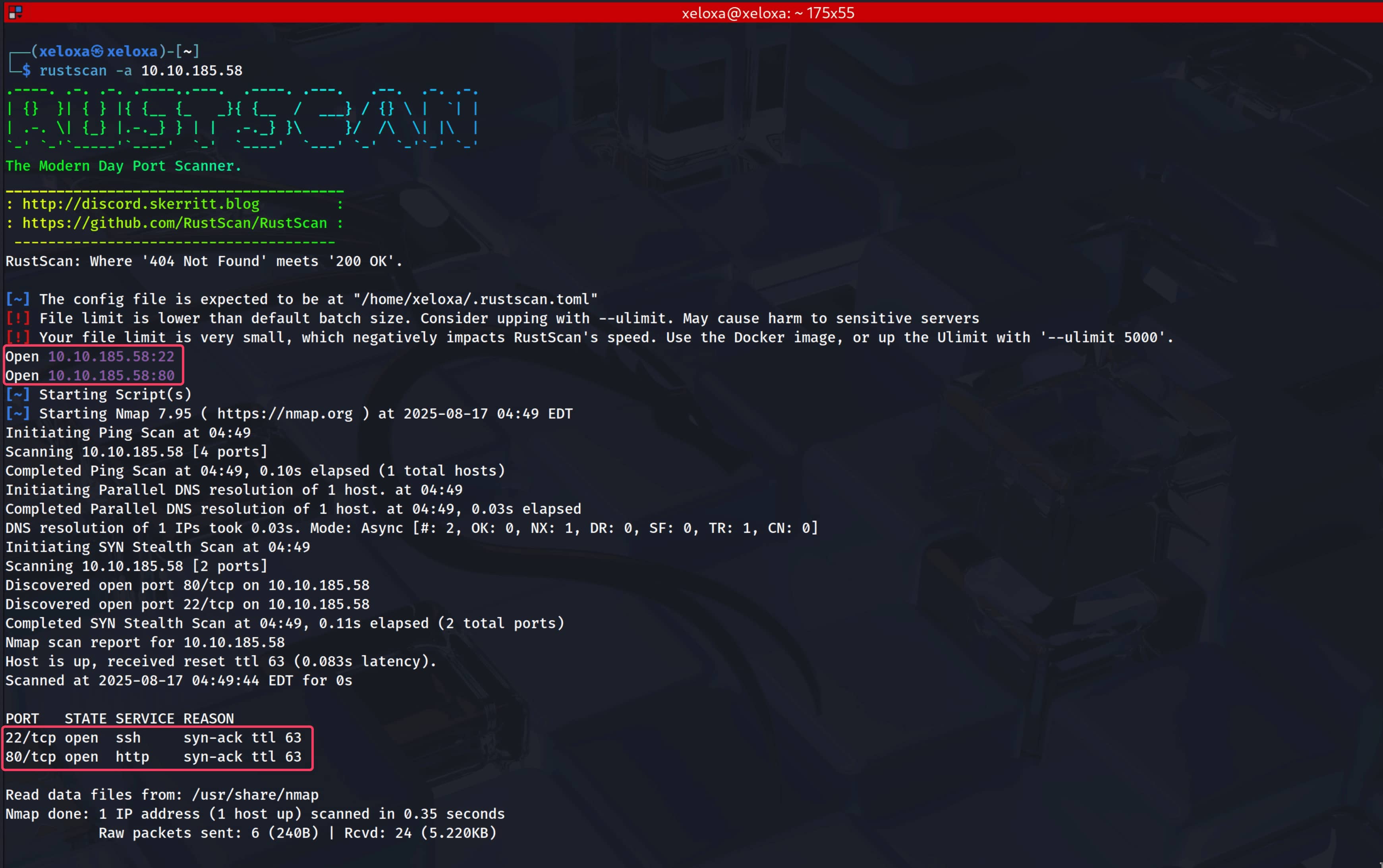 As our first step, we perform a port scan on the target IP address. First, for speed, we scan all ports with rustscan -a 10.10.185.58, and then for a detailed scan on the open ports we found, we use the command nmap 10.10.185.58 -p22,80 -A -T4. (If we had tried to scan all ports with Nmap, it would have taken a long time, which is why we used rustscan first.)