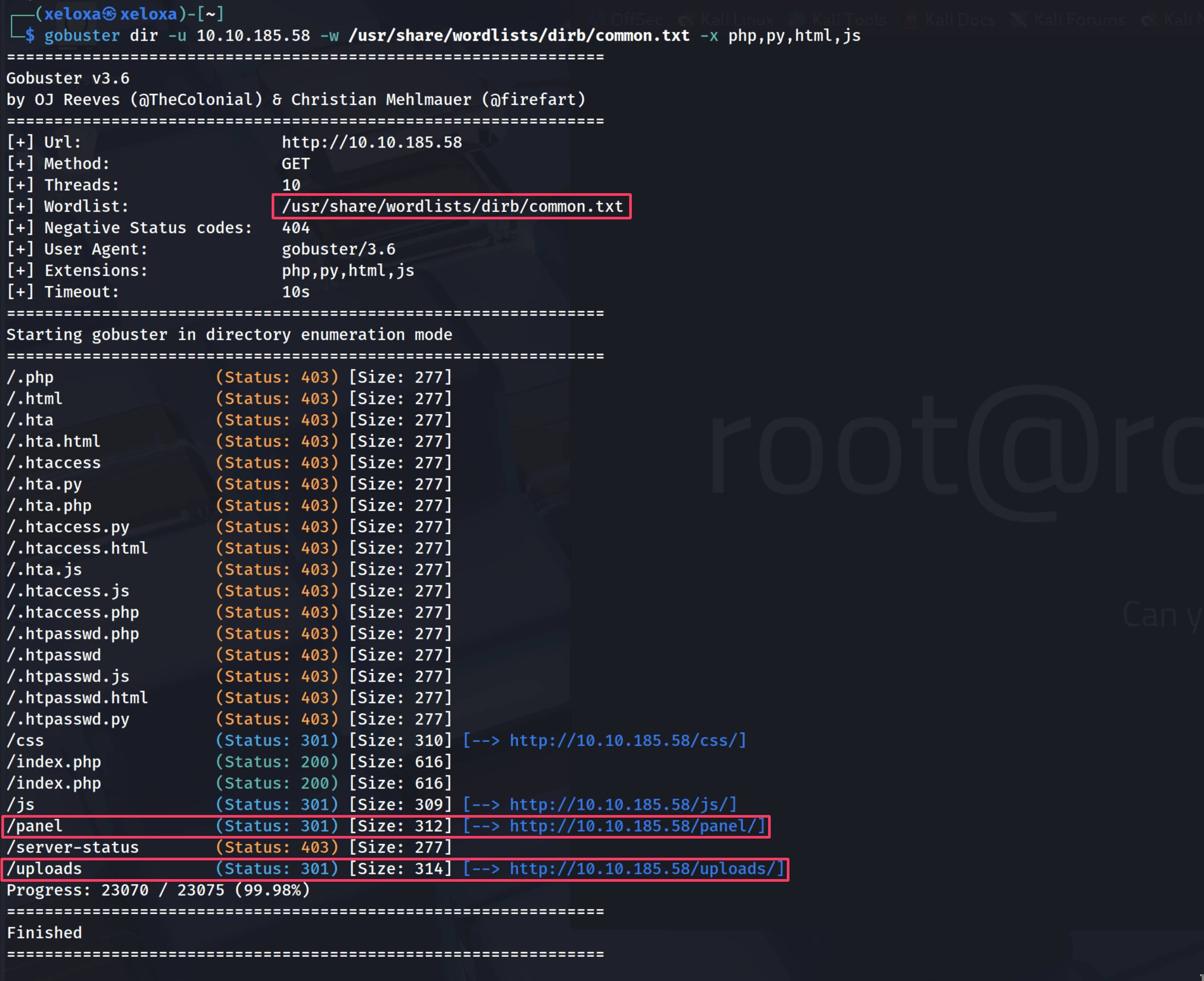 $gobuster dir -u 10.10.185.58 -w /usr/share/wordlist/dirb/common.txt -x php,py,html,js