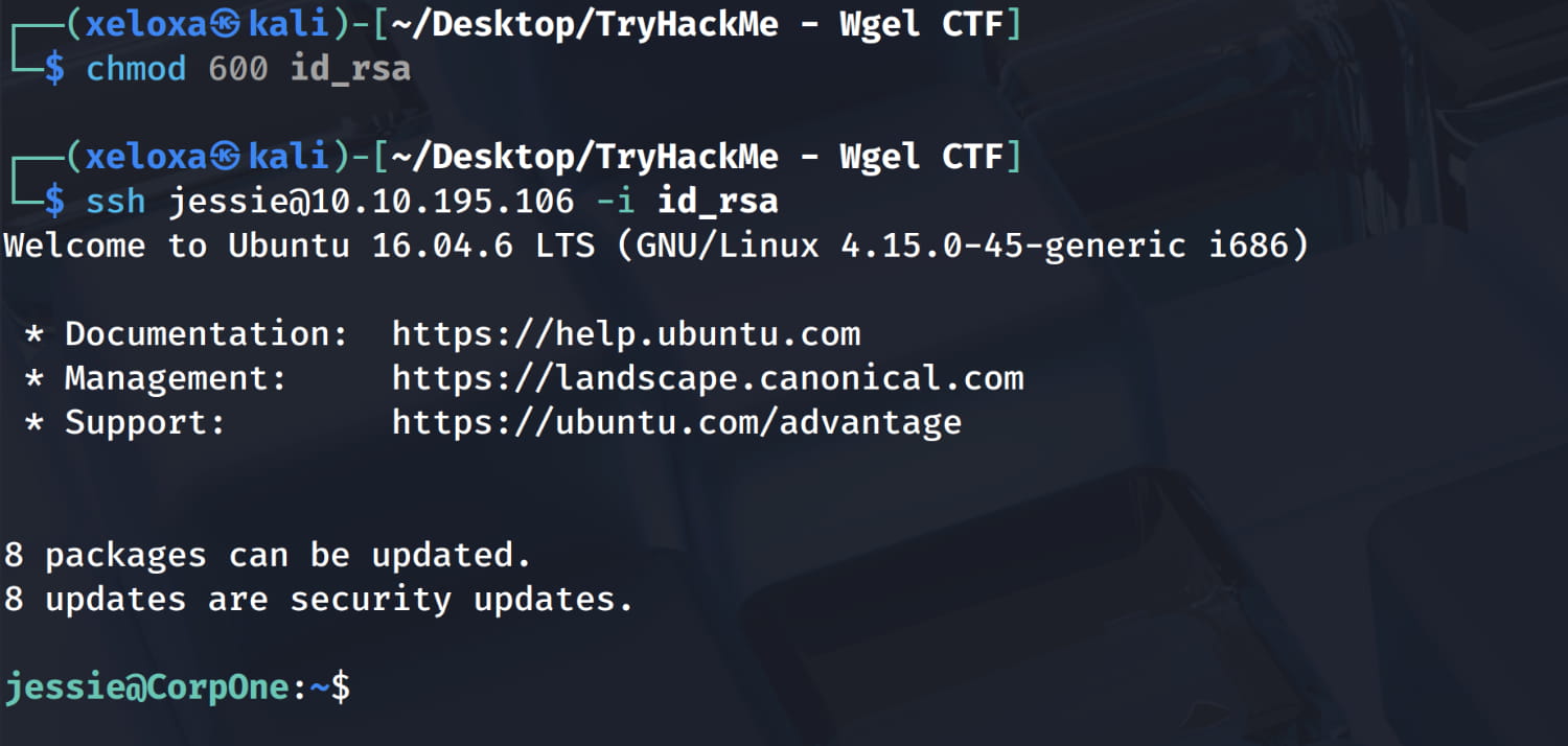 Here we find an SSH key. Let's try to log in to the open SSH port with the username jessie we found using this key.
