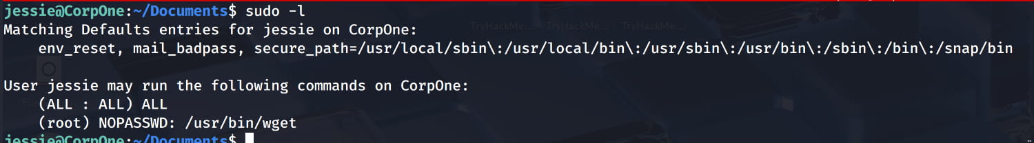 We can see that with a simple command, the jessie user can use the /usr/bin/wget binary with sudo privileges without needing a password.