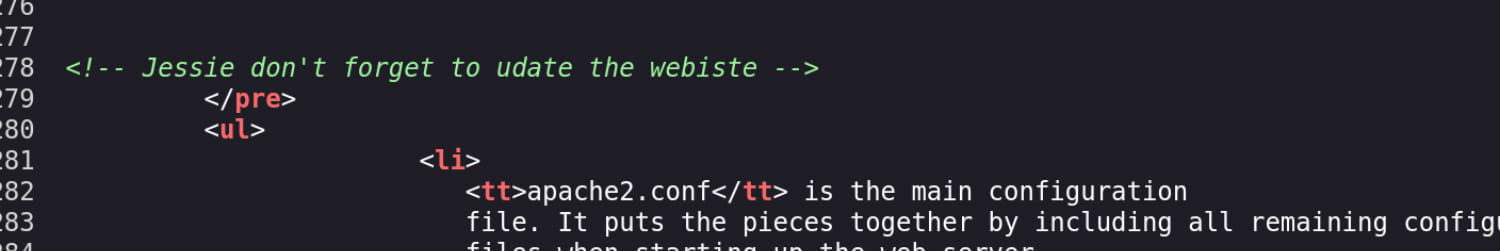As you can see, we have an Apache page. When we examine the source code of this page, we find the username jessie.
