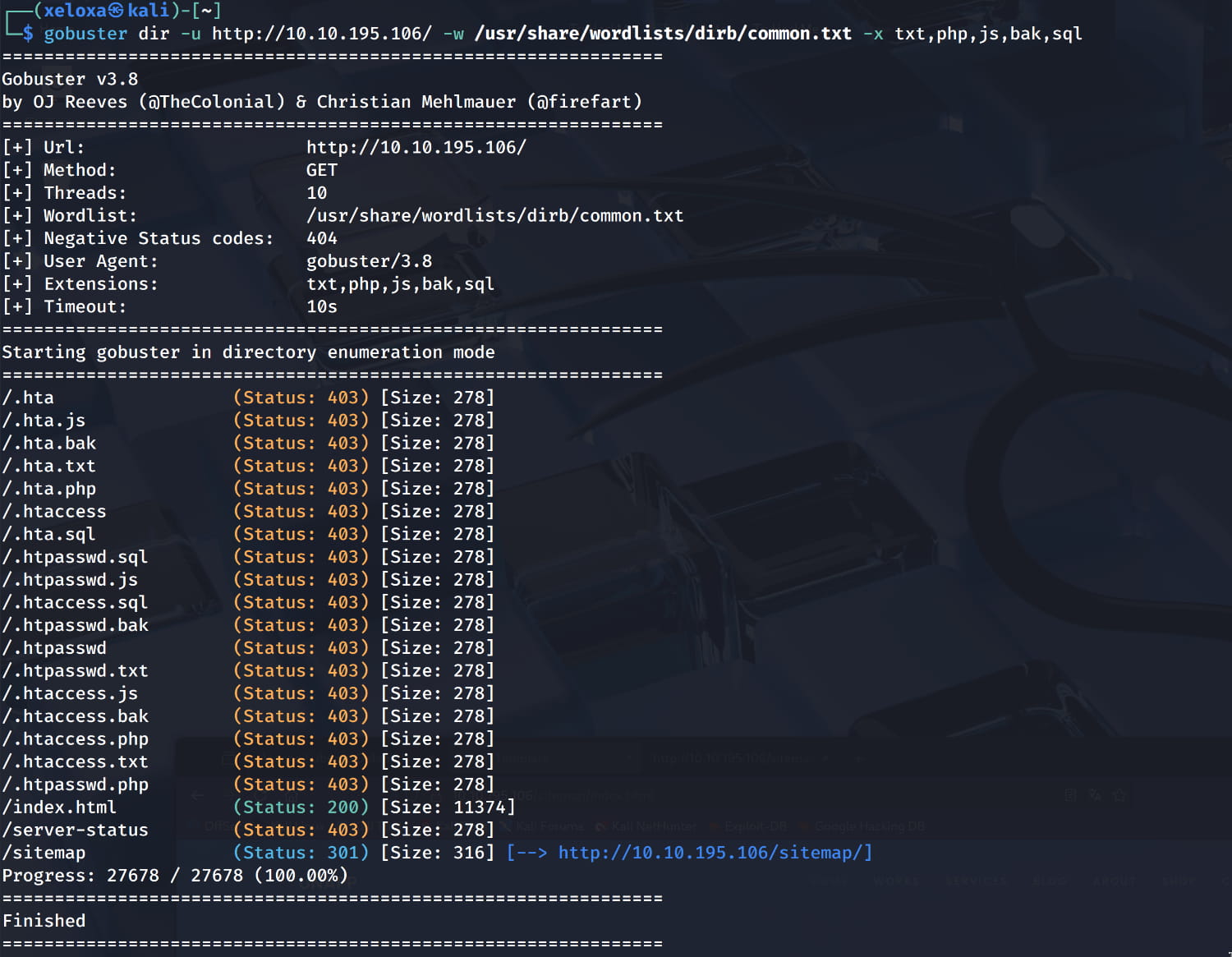 We don't have anything at the moment. In that case, let's run another subdirectory scan for a /sitemap directory using gobuster; perhaps we can find something here.