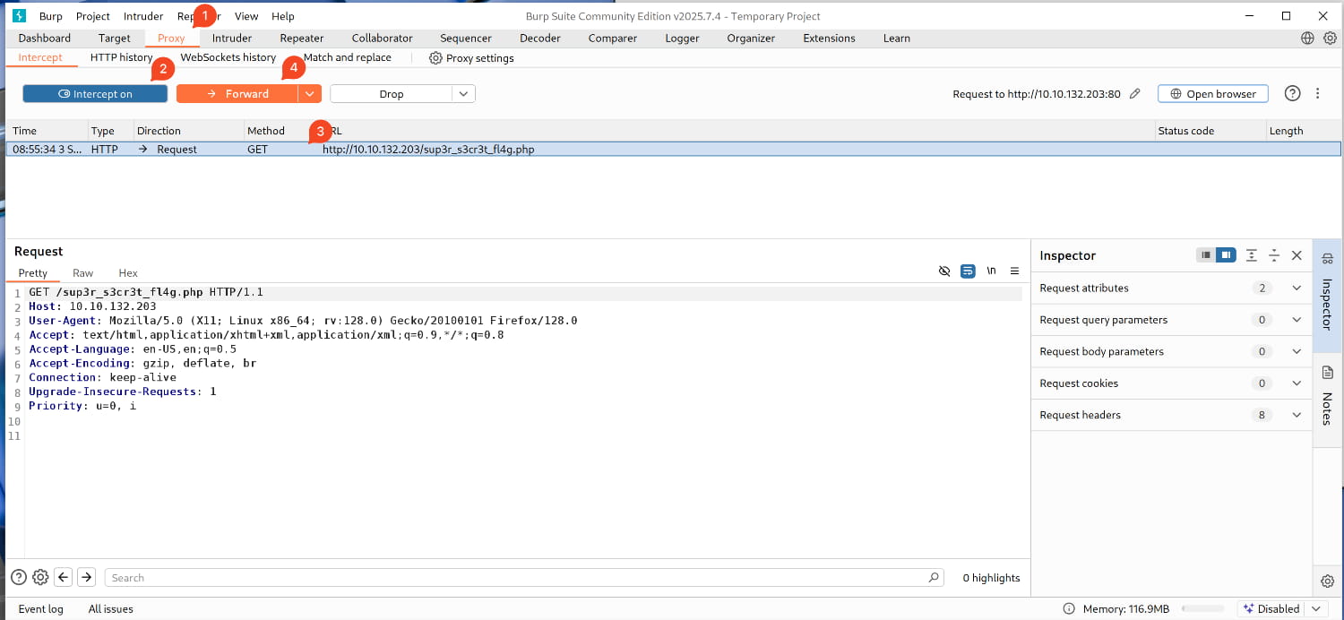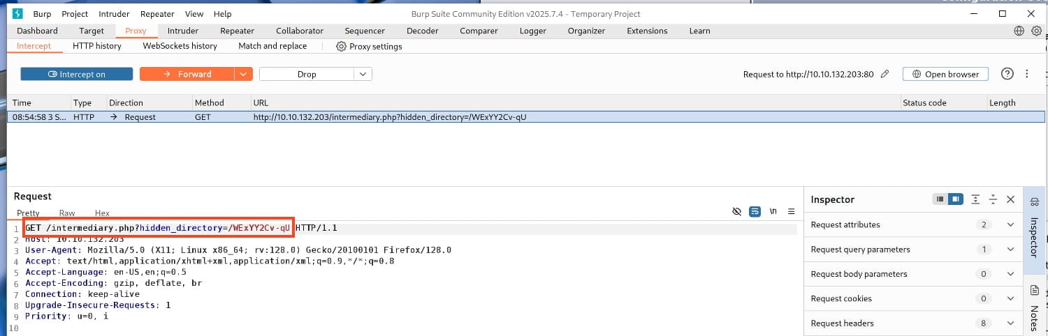 - Something unusual happened, and BurpSuite captured another request. This time, the request contains hidden directories.
