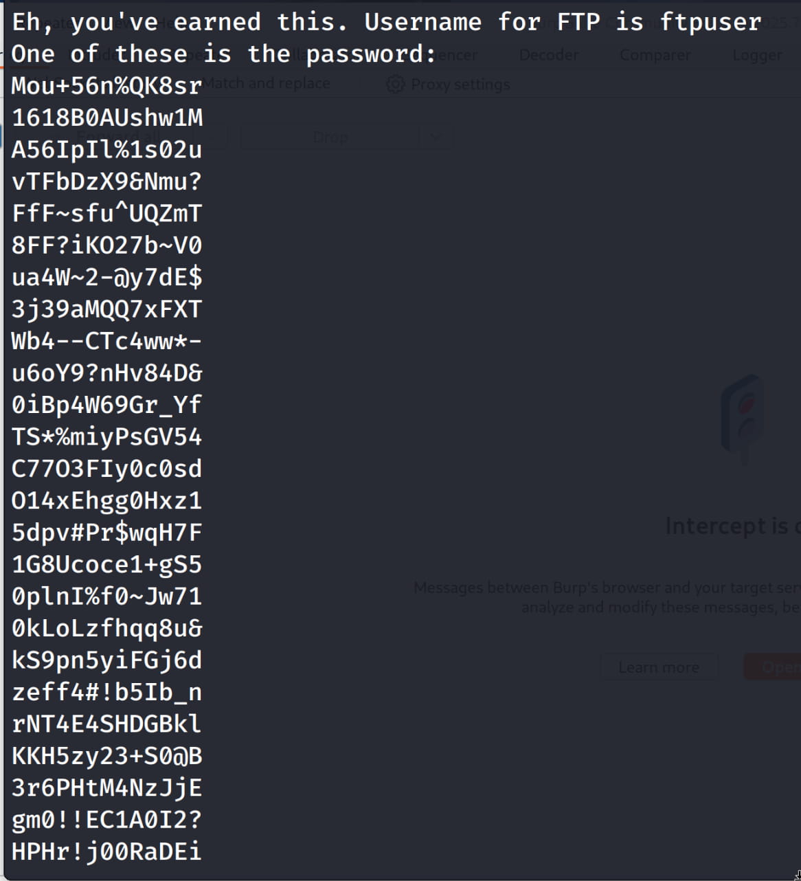 From here, we get the pair ftpuser:5iez1wGXKfPKQ. Now, let's log in to FTP with this information.