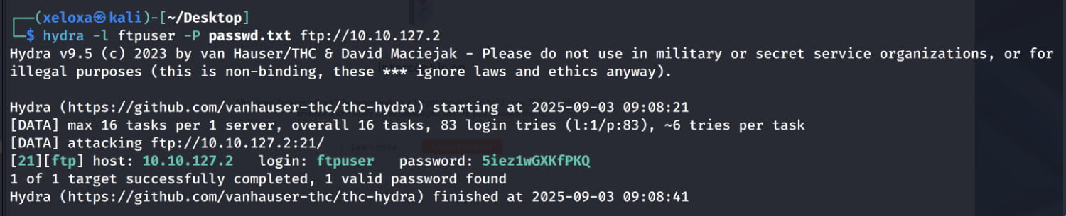 Now, let's use hydra to check this information for the FTP server. (Note: The machine's IP changed at this point due to an issue on my end. 10.10.132.203 => 10.10.127.2)