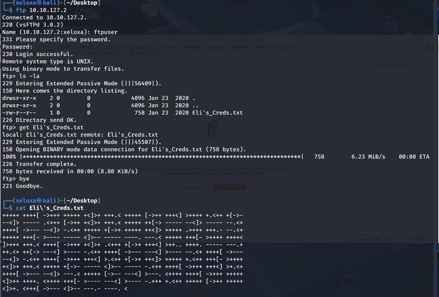 When we look at the shared files here, we find the Eli's_Creds.txt file and a string hashed with BrainF*ck inside. Now, let's copy this hash and crack it on https://www.dcode.fr/brainfuck-language. As a result, we get: