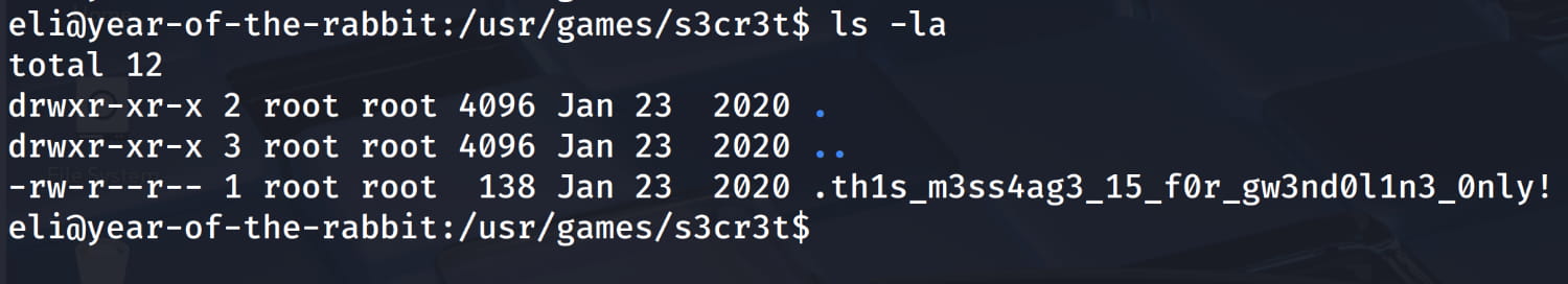 And yes, when we check, we get the /usr/games/s3cr3t directory and a hidden file in this directory. Now, let's check this file.