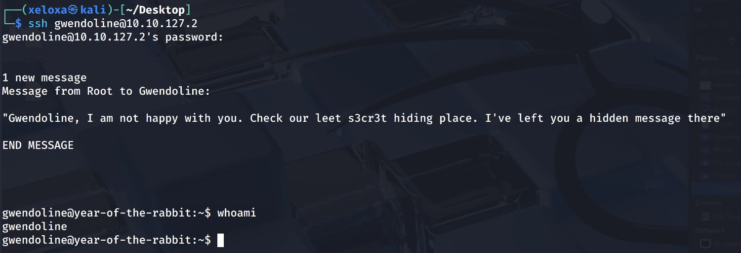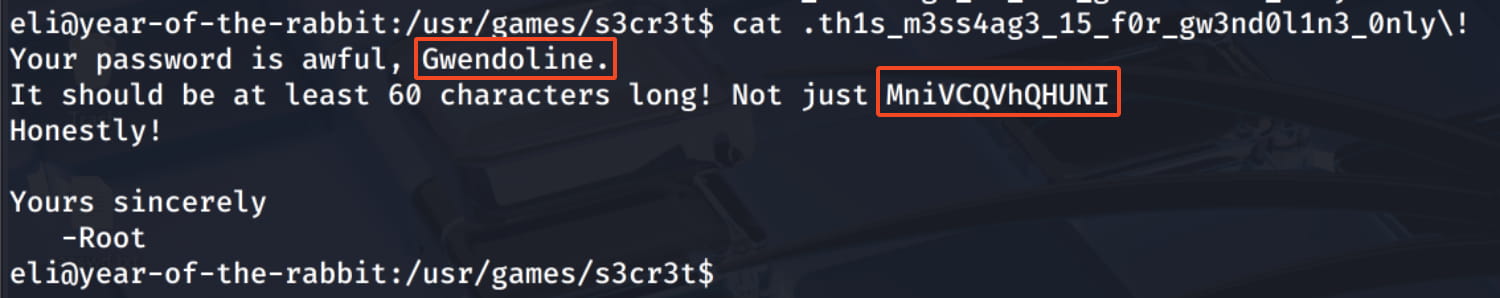 From here, we learn about the user gwendoline and that a secret message was left for them by the administrator. So, let's do a simple scan with find to find the secret hiding places. (You can also run linpeas.sh, etc.)