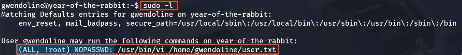 When we examine the vulnerability, we can run a program with root privileges using sudo -u#-1. In our case, we are allowed to use /usr/bin/vi /home/gwendoline/user.txt.