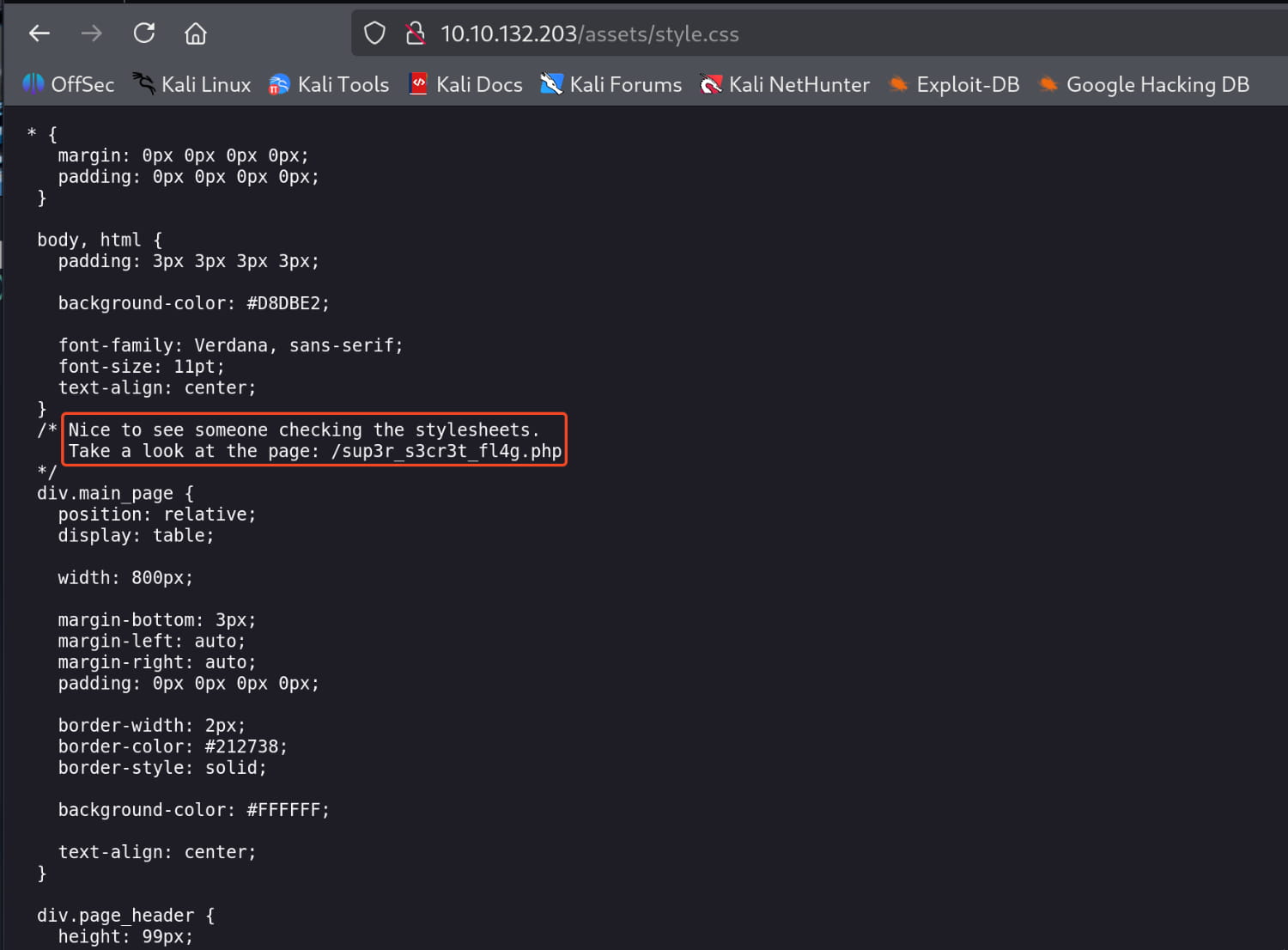 We have two files here. When we check the style.css file, it gives us a hidden page.