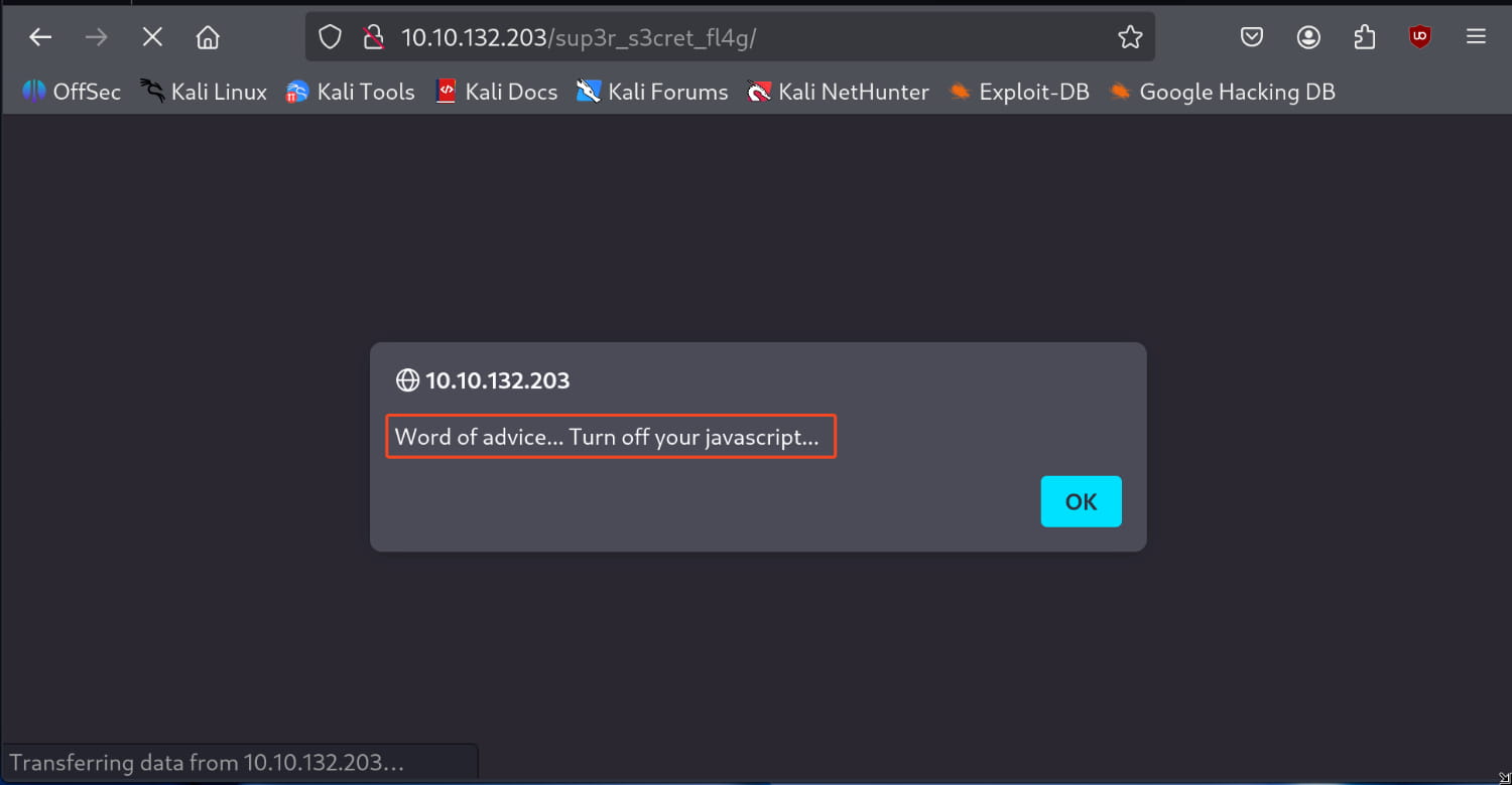 Let's open BurpSuite and try to capture the outgoing requests. Since it told us to disable JavaScript, we might be able to get something from the requests.