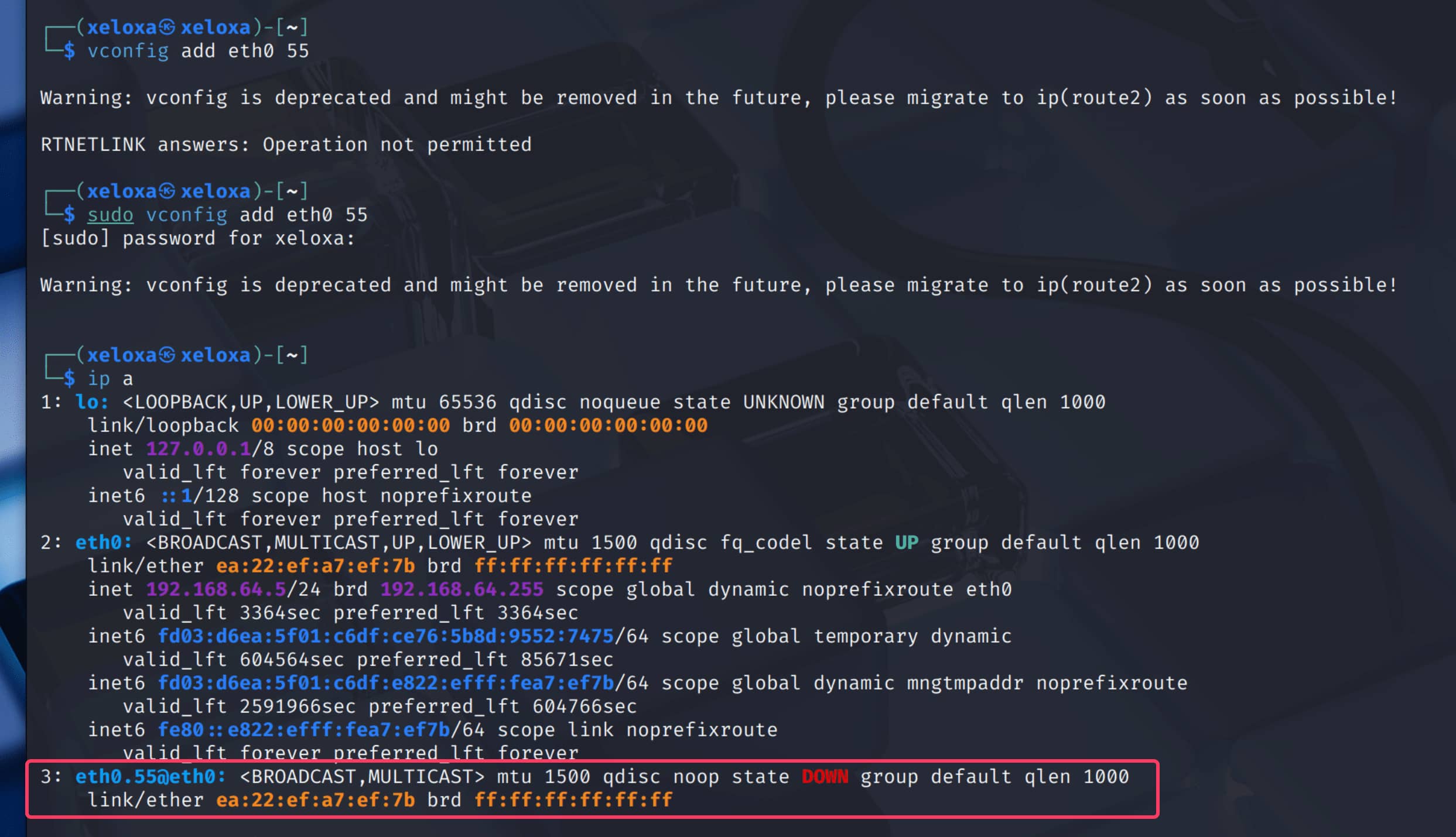 vconfigto create a new interface on eth0 that is a member of the desired VLAN, for example, 55: